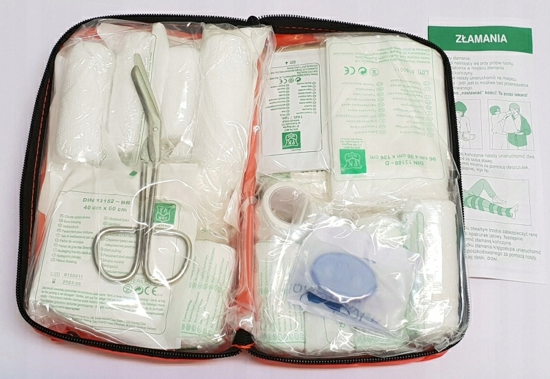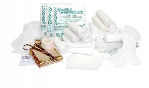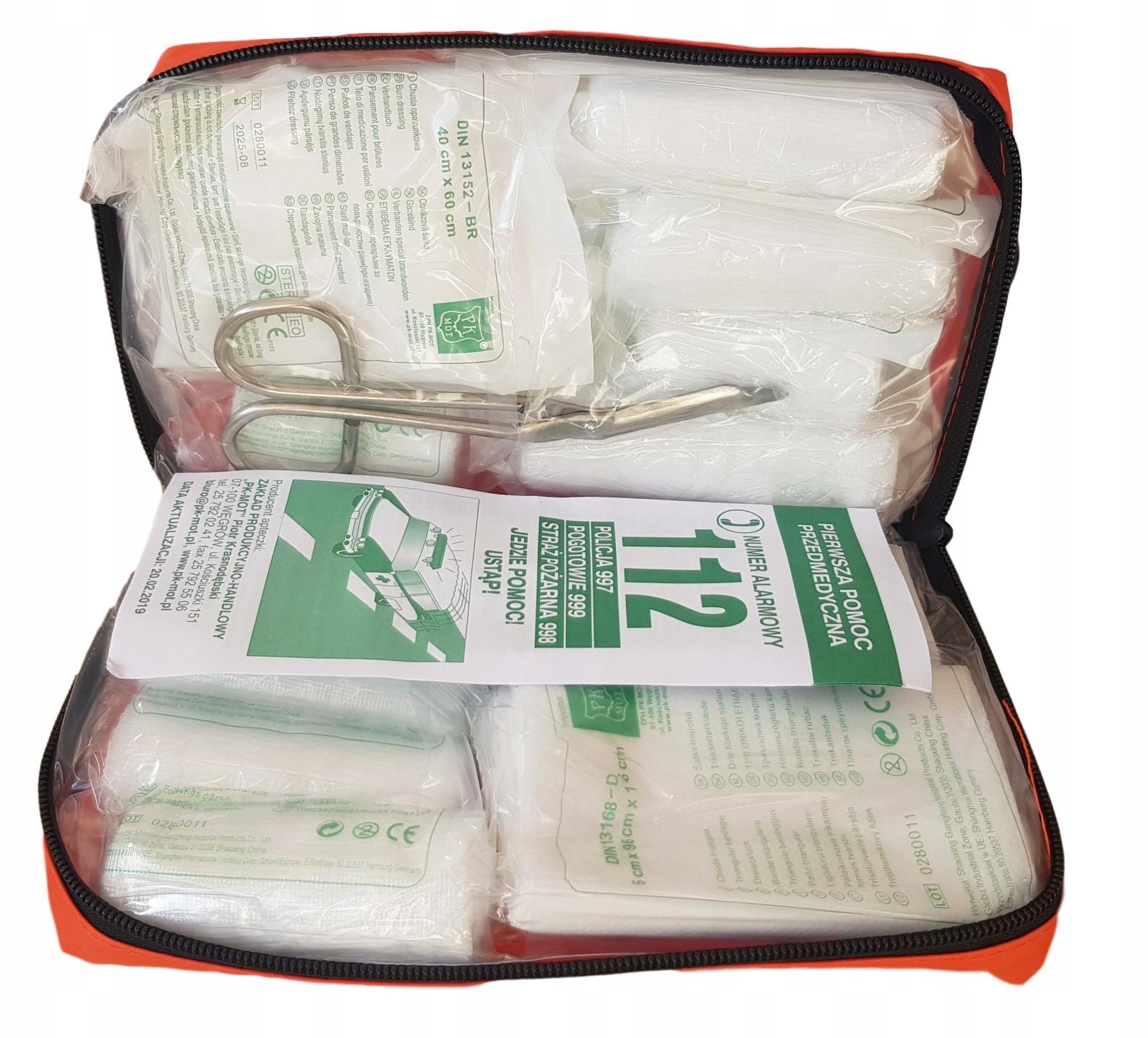 - ? Zawiera niezbędne środki pierwszej pomocy – bandaże, plastry, kompresy, chusta, rękawiczki i wiele więcej