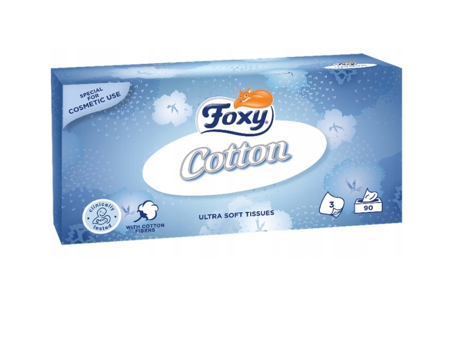 Chusteczki higieniczne Foxy Cotton wzbogacone zostały miękkimi włóknami bawełny, dlatego są delikatne, wytrzymałe i nie podrażniają skóry.