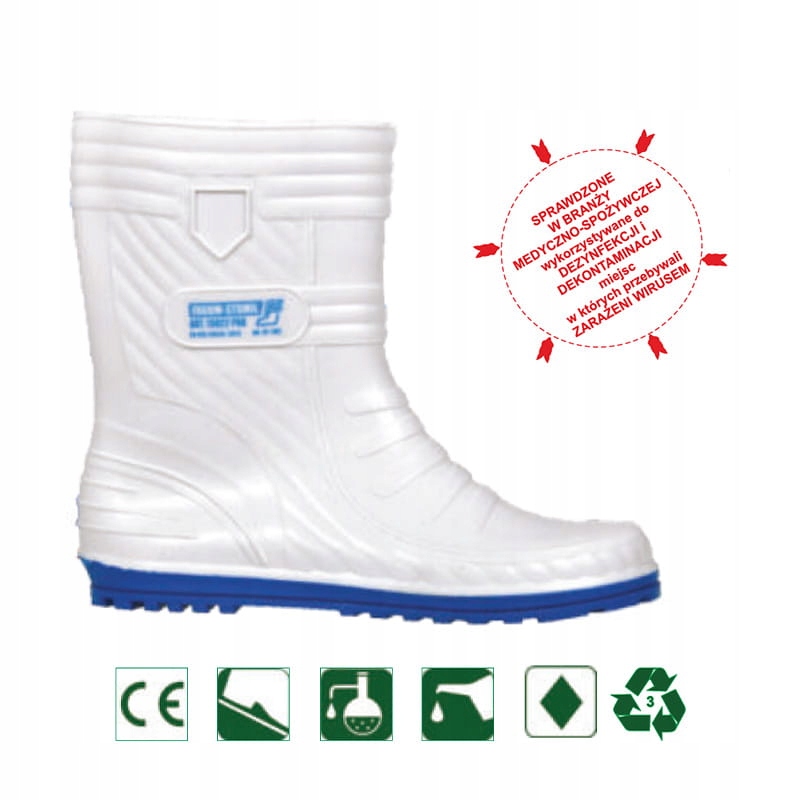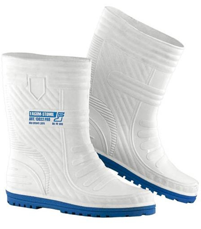 Damskie biało niebieskie kalosze FAGUM STOMIL 13022 sprawdzą się w branży medycznej i spożywczej. Mogą być wykorzystywane do dezynfekcji i dekontaminacji. Wykonane są w wysokiej jakości tworzywa PVC modyfikowanego kauczukiem. Spełniają wymagania normy EN ISO 20347 OB FO. Posiadają antypoślizgową podeszwę klasy SRC.