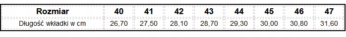 - Rozmiary: 40, 41, 42, 43, 44, 45, 46, 47.
