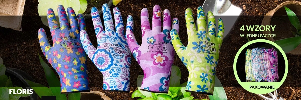 ✅ Rękawice robocze, dziane FLORIS MIX to ochronne, powlekane nitrylem rękawice do prac domowych i ogrodowych. Wykonane z bezszwowej dzianiny poliestrowej (ścieg 13, 100% poliester) z SUPERMODNYM wzorem kwiatowym.