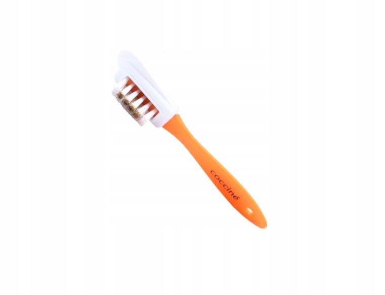 Szczotka do czyszczenia zamszu na sucho z dwoma krawędziami roboczymi: kostka do zamszu – znakomicie zdejmuje zabrudzenia użytkowe z obuwia, szczotka miedziana – czyści głęboko wtarty brud.