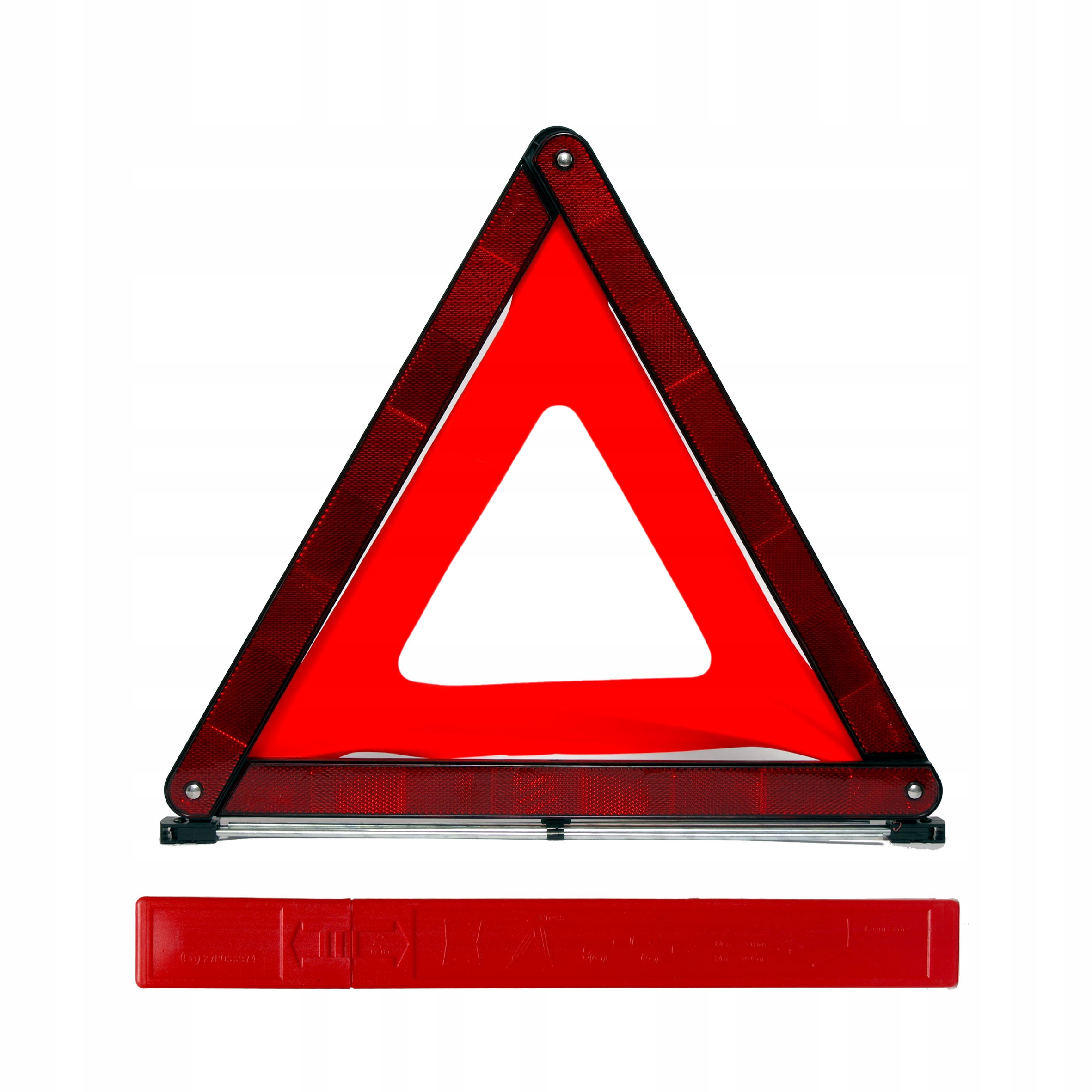 Trójkąt ostrzegawczy w plastikowym pudełku- pudełko ma wymiary: 44 x 5 x 3 cm.