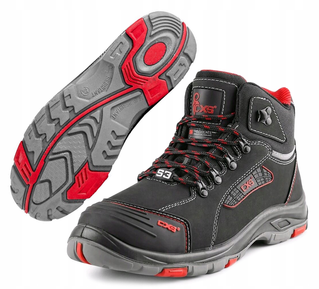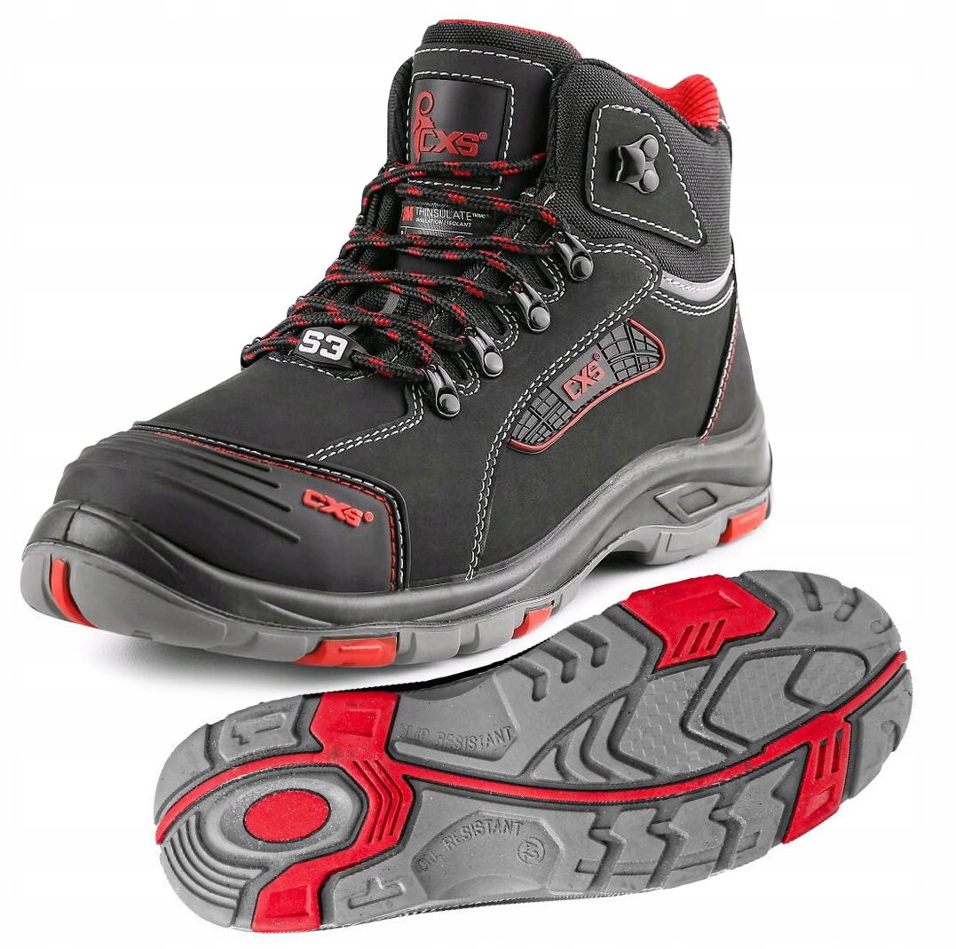 TRZEWIKI ZIMOWE CXS ROCK PEPRIT S3. Obuwie bezpieczne z ochrona w formie podnoska i antyprzebiciowej podeszwy. Solidnie zaprojektowane obuwie ochronne. Sprawdzi się w trudnym środowisku roboczym. Kolor: czarno – czerwony. Rozmiar: 37 – 48. Cholewka: hydrofobowa gładka skóra nubukowa o grubości 1,6-1,8mm połączona z dodatkami PU. Podszewka: oddychająca i odporna na ścieranie wyściółka tekstylna. Ocieplenie: Thinsulate (gramatura 200g). Konstrukcja: wysoka cholewka w kombinacji – skóra/ PU, miękko wykończony kołnierz i język, elementy odblaskowe, dopasowanie za pomocą sznurowania, oddychająca wyściółka tekstylna, ocieplenie Thinsulate (gramatura 200g), wzmocnienie PCV części przedniej przed ścieraniem, stalowy podnosek ochronny i stalowa podeszwa środkowa, stabilna podeszwa PU/guma. Podeszwa jest olejoodporna, antystatyczna, przeciwpoślizgowa, odporna na przebicie i ciepło kontaktowe do 300°C. Zastosowanie: branża budowlana, zakłady produkcyjne, warsztat, motoryzacja, magazyn, transport, logistyka.