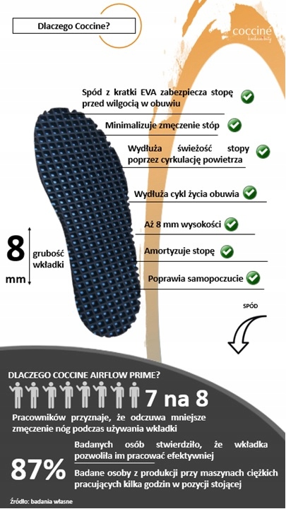 Wybierając wkładki Cocciné wybierasz bezpieczeństwo nie tylko swoich stóp, ale także swojego portfela. Ich zakup nie jest wydatkiem, a mądrą inwestycją – inwestycją w jakość, trwałość, zdrowie i bezpieczeństwo na każdym kroku. Wyprodukowane w Polsce z wyłącznie certyfikowanych materiałów będą służyć przez długi czas. Daj szansę sobie i swojemu zdrowiu – wybierz mądrze, wybierz polskie produkty Cocciné.