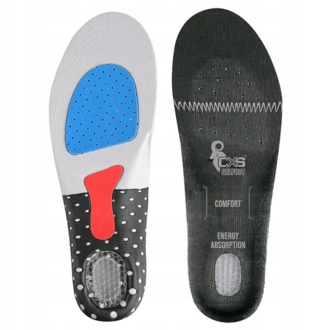 Wkładki CXS GELFOOT to żelowe, antystatyczne wkładki o ergonomicznej konstrukcji. Zapewniają wysoki komfort użytkownikowi dzięki żelowemu wzmocnieniu w przedniej części o TPR w części piętowej. Absorbują i amortyzują wstrząsy w pięcie, oraz dają wsparcie dla nóg podczas dłuższego chodzenia i stania. Dzięki swojej budowie pomagają zmniejszyć nacisk na stawy i więzadła stopy. Zapobiegają urazom stopy.